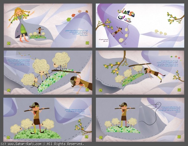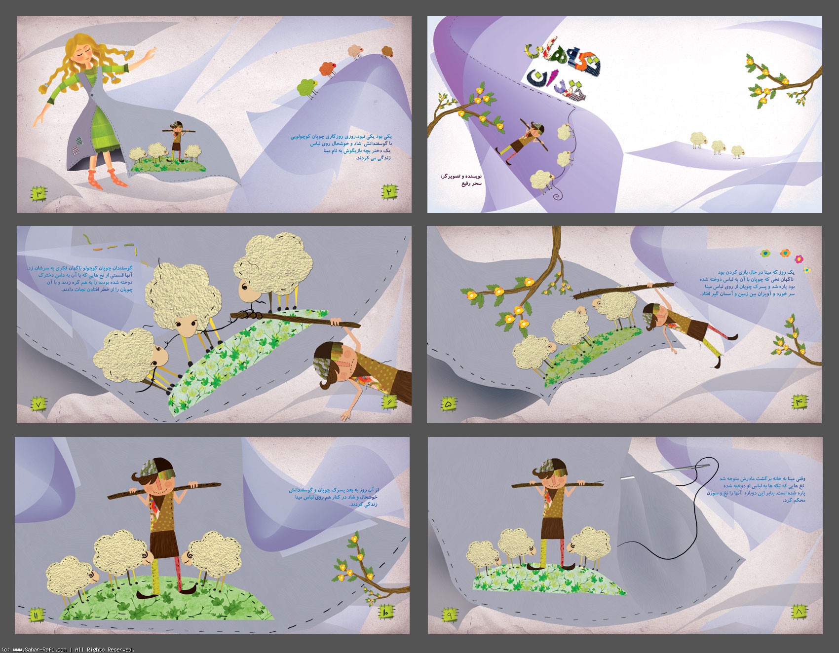 این مجموعه شامل شش فریم تصویرسازی یکی از کتاب داستان هایم با نام "تکه های خندان" است. این داستان ماجرای افتادن چوپان تکه دوزی شده از روی لباس یک دختر بازیگوش و نجات دادنش توسط گوسفندان روی لباس رو تعریف می کنه.