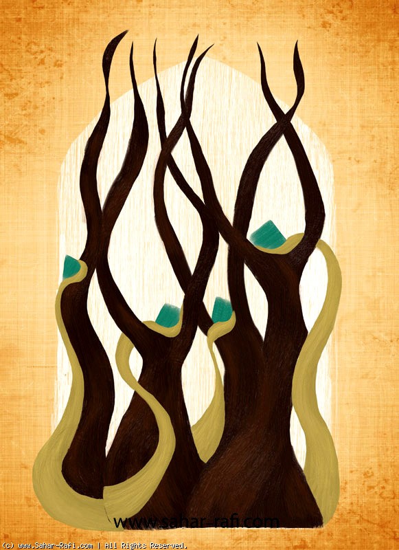 این کار رو برای دومین دوسالانه تصویرگری نیایش طراحی کردم. استفاده از نقطه های سبزآبی و حرکت نستعلیق مانند شال ها به عنوان نماد سنتی-ایرانی و قرار دادن انسان در هیبت درخت را نشانی برای بیان رشد و صعود به درگاه الهی در نظر گرفتم طوری که تداعی گر رقص سماع هم باشه! و برای جهت دادن نگاه رو به بالا از بافت های براشم کمک گرفتم.