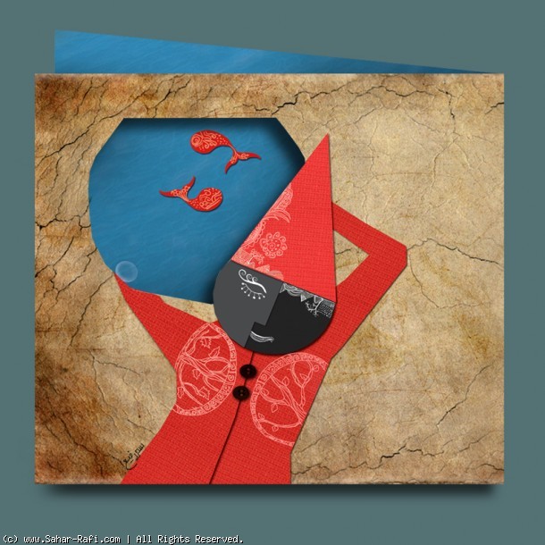 ایده این کارت پستال رو خودم خیلی دوست داشتم. با برشی که در صفحه اول ایجاد کردم حاجی فیروز را (که در فرهنگ ما تداعی گر زایش و رویش گیاهان از دل زمین خشک و سرد است) با تنگ آبی با دو ماهی که نماد چرخش شب و روز است نشان داده ام. با باز شدن کارت گویی این ماهی ها از اسارت تنگ در می آیند و در دل دریای آبی که سفره هفت سینی را در میان مرجان ها جا داده است؛ شناور می شوند.